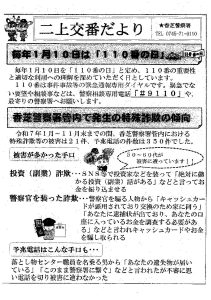 2026-01-07 / 最終更新日時 : 2026-01-07 kitaimaichi02 二上交番だより 毎年1月10日は「110番の日」と定めています。 110番は事件事故等の緊急通報専用ダイヤルです。 緊急でない要望や相談事などは、警察相談専用電話「#9110」や最寄りの警察署へお願いします。 詳しくは、回覧をご覧ください。
