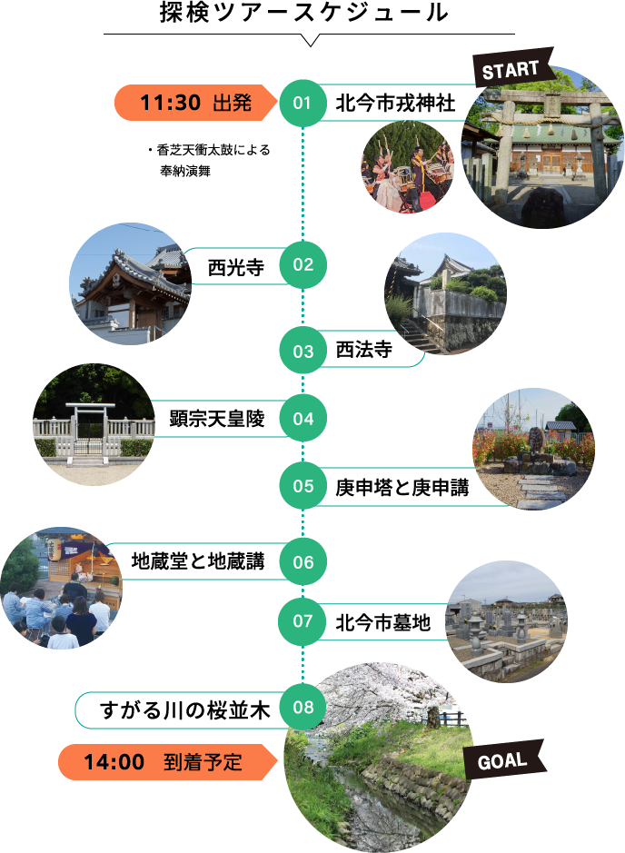 イベント 案内者とともに、北今市にある名所 8か所 を歩いて巡ります。 桜を楽しみながら、地域の歴史や魅力にふれてみませんか 参加費用 500円(中学生以上/軽食あり) 小学生以下は無料/軽食なし 集合場所 北今市公民館 集合時間 11:00 募集人数 30名(先着順) お申し込みはこちら 定員になりしだい、締め切らせていただきます。 ・徒歩での移動となりますので、歩きやすい服装・靴でご参加ください。 ・小雨決行(荒天時は中止となる場合があります) ・当日の状況により、内容が一部変更となる場合があります。 ・小学生以下のお子様が参加される場合は、必ず保護者の方と一緒にご参加ください。 ・小学生以下の参加は無料ですが、軽食はありません。 ゴミは各自お持ち帰りください。 小さなお子さまから目を離さず、必ず保護者の方が付き添ってください。 会場には駐車場はありません。公共交通機関や徒歩でお越しください。 会場内では係員・スタッフの指示に従ってください。 危険物(花火・刃物・ドローン等)の持ち込みは禁止です。 会場内外での事故・ケガ・盗難等について、主催者は任を負いかねます。 体調のすぐれない方は参加をお控えください。 周辺住民のご迷惑にならないよう、騒音や喫煙マナーにご配慮ください。 ペットをお連れの場合は、必ずリードを付け、フンの後始末をお願いします。 皆さまが安全に楽しめるようご理解とご協力をお願いします。
